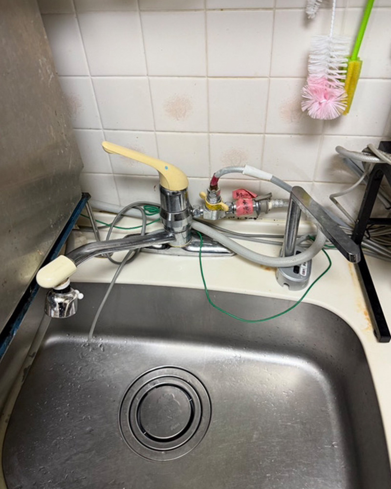 長年の使用により蛇口内部の部品が消耗していたことで、蛇口まわりから水が漏れはじめていました。万が一この状態のまま修理せず使い続けると、シンク下や床に水が染み込み、カビの発生や腐食のリスクがあります。こうした劣化は放置せず、早めの対応が必要です。