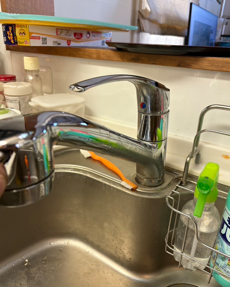 蛇口本体の経年劣化により、水が微量ながら漏れている状態でした。水漏れは見えにくい分、毎日少しずつ水道代が無駄にかかってしまいます。また、シンク周りの湿気やカビの原因にもなります。今回、本体ごと新品に交換することで、水漏れを防ぎ、光熱費の改善ができしました。
